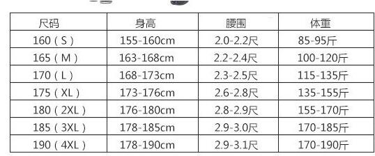 工作服尺碼換算參照表
